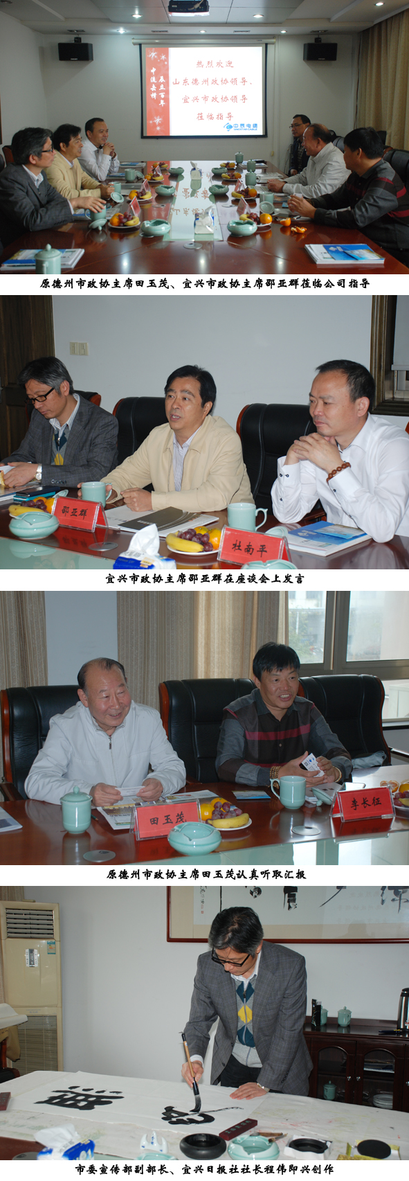 隨后,田主席一行認真聽(tīng)取了公司董事長(cháng)杜南平對公司總體情況、產(chǎn)品特點(diǎn)、公司未來(lái)發(fā)展目標以及發(fā)展中的困難與思考等內容的匯報,并聽(tīng)取了總經(jīng)理姜一鑫就我公司現有產(chǎn)品的功能、技術(shù)工藝以及在市場(chǎng)的定位與產(chǎn)品未來(lái)的發(fā)展趨勢情況的匯報。田主席饒有興趣地傾聽(tīng)并不時(shí)提問(wèn),了解產(chǎn)品的適用范圍及具體細節。在雙方座談期間,市委宣傳部副部長(cháng)、宜興日報社社長(cháng)程偉還與德州晚報社長(cháng)、總編李長(cháng)征就企業(yè)文化建設、企業(yè)品牌發(fā)展等問(wèn)題進(jìn)行了深入探討,并一起交流了書(shū)法藝術(shù),程部長(cháng)還即興創(chuàng )作了書(shū)法作品以留念。