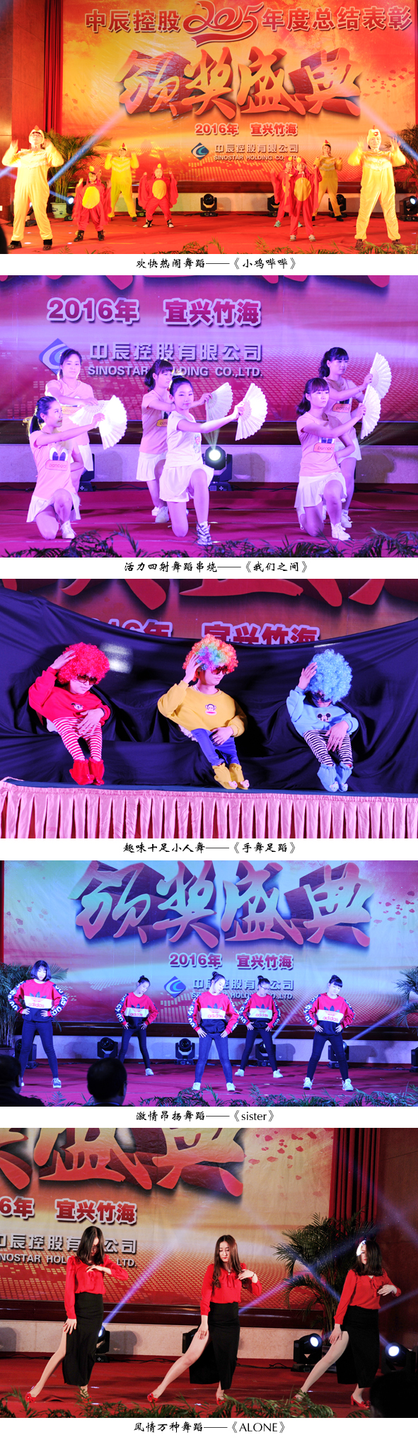 頒獎盛典在沙畫(huà)《2015,騰飛的中辰》MV中拉開(kāi)帷幕。歡快熱鬧的《小雞嗶嗶》、優(yōu)美典雅的《雨巷》、活力四射的《我們之間》、激情昂揚sister》、風(fēng)情萬(wàn)種的《ALONE,風(fēng)格各異的舞蹈帶來(lái)了無(wú)與倫比的視覺(jué)感受,更有幽默風(fēng)趣的小品《診所風(fēng)波》、飽含深情的彈唱《旅行的意義》、慷慨激昂的詩(shī)朗誦《黨在我心中》以及趣味十足的小人舞《手舞足蹈》,精彩紛呈。全體與會(huì )者的情緒一次次被點(diǎn)燃,現場(chǎng)熱浪滾滾,歡呼的聲音在會(huì )場(chǎng)經(jīng)久不息地蕩漾,不僅給大家帶來(lái)了歡聲笑語(yǔ),同時(shí)也讓同事之間彼此的心更加貼近。整個(gè)頒獎盛典張弛有度、料點(diǎn)十足、一氣呵成,表演者更是才華橫溢、大放光彩,晚會(huì )在合唱《超越夢(mèng)想》的歌聲中完美圓滿(mǎn)地落下帷幕。