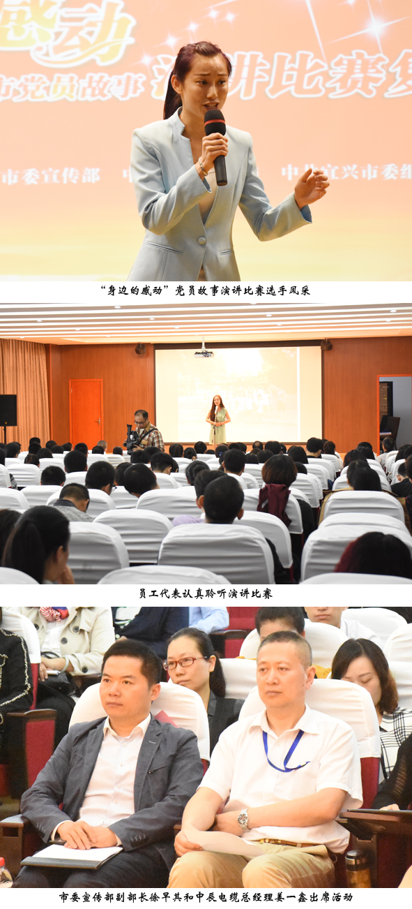 5月20日下午,由宜興市委宣傳部、市紀委、市委組織部聯(lián)合舉辦的“身邊的感動(dòng)”黨員故事演講比賽復賽第四場(chǎng)在中辰電纜會(huì )議室舉行,來(lái)自全市各有關(guān)單位的24位選手演講了24位黨員的感人故事,100余位員工代表聆聽(tīng)了演講,宜興市委宣傳部副部長(cháng)徐早其等領(lǐng)導擔任了本次比賽評委,中辰電纜總經(jīng)理姜一鑫應邀出席。