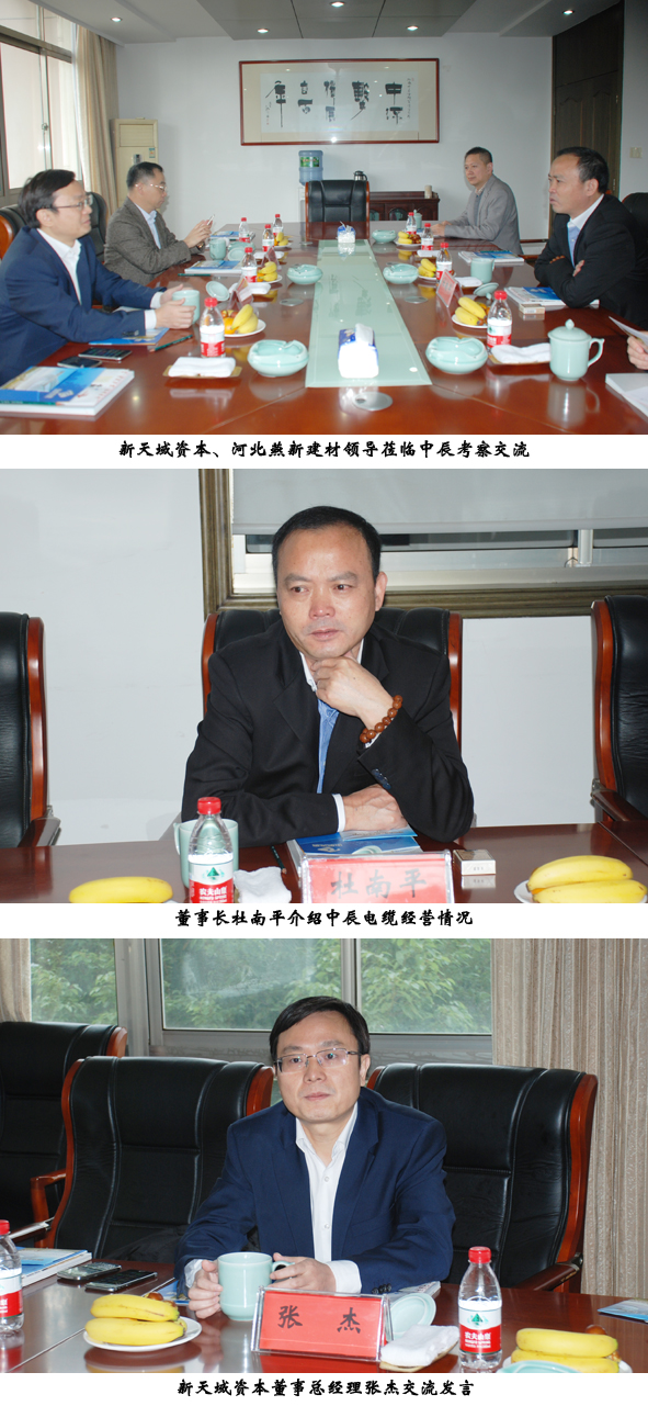 11月13日,新天域資本董事總經(jīng)理張杰、河北燕新建材有限公司董事長(cháng)王季文蒞臨中辰電纜考察交流,董事長(cháng)杜南平、總經(jīng)理姜一鑫及副總經(jīng)理徐積平熱情接待了來(lái)訪(fǎng)領(lǐng)導。